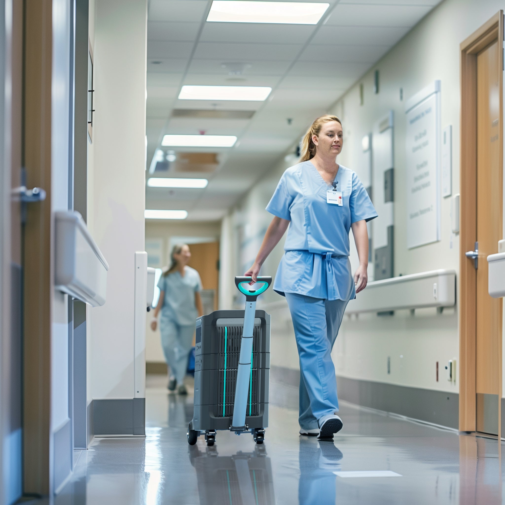 Four rubber wheels and a suitcase-style trolley bar ensure effortless transportation, saving you time and labor. The rubber material ensures that EnergyCan moves quietly, avoiding disturbances to medical staff and patients.